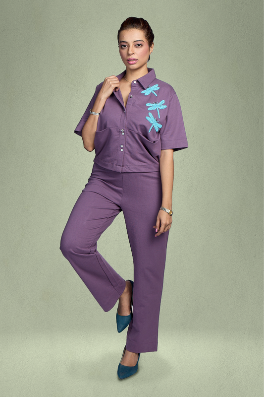 Dragonfly Twin Button Shirt Coord Set - Grape